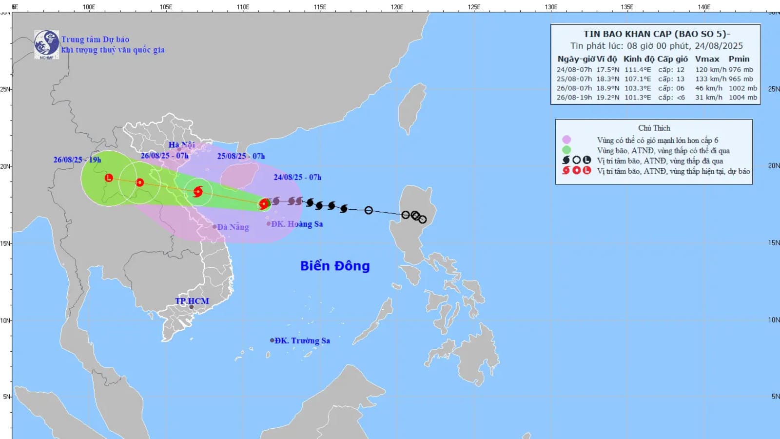 Theo thông tin từ Trung tâm Dự báo Khí tượng Thủy văn quốc gia, sáng 23/8 áp thấp nhiệt đới trên Biển Đông đã mạnh lên thành bão số 5, tên quốc tế là KAJIKI